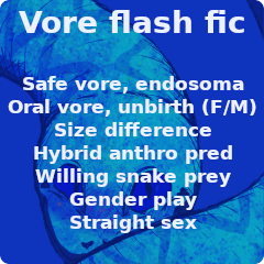 It didn't take long for his hemipenes to reach their full length, brushing against the smooth surface of Sam's tongue. More of his upper body disappeared into the gluttonous kneading of her esophagus. She continued to slurp without swallowing, tasting his pre-leaking rods as he was greedily claimed. By the intensity of her hastening pulse on his ears, Muno must have been inside her chest. With his widest part passing her epiglottis, there wasn't much left of him outside.